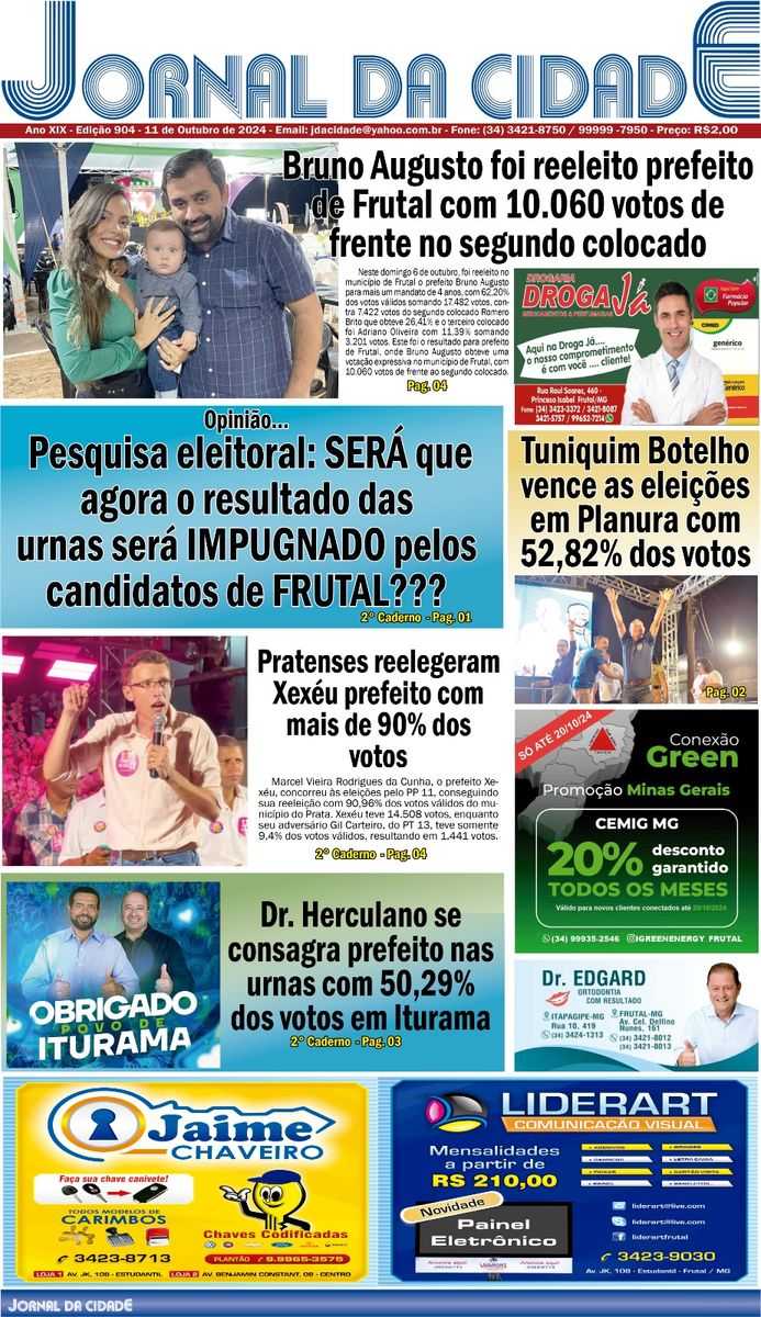 TRE-MG afasta multa, rejeita cassação e mantém mandato do prefeito Bruno Augusto em FrutalO mandato do prefeito de Frutal foi consagrado VENCEDOR também na Justiça Eleitoral, referendando os mais de 10 mil votos de frente, nas urnas, frente ao segundo colocado Romero Brito.