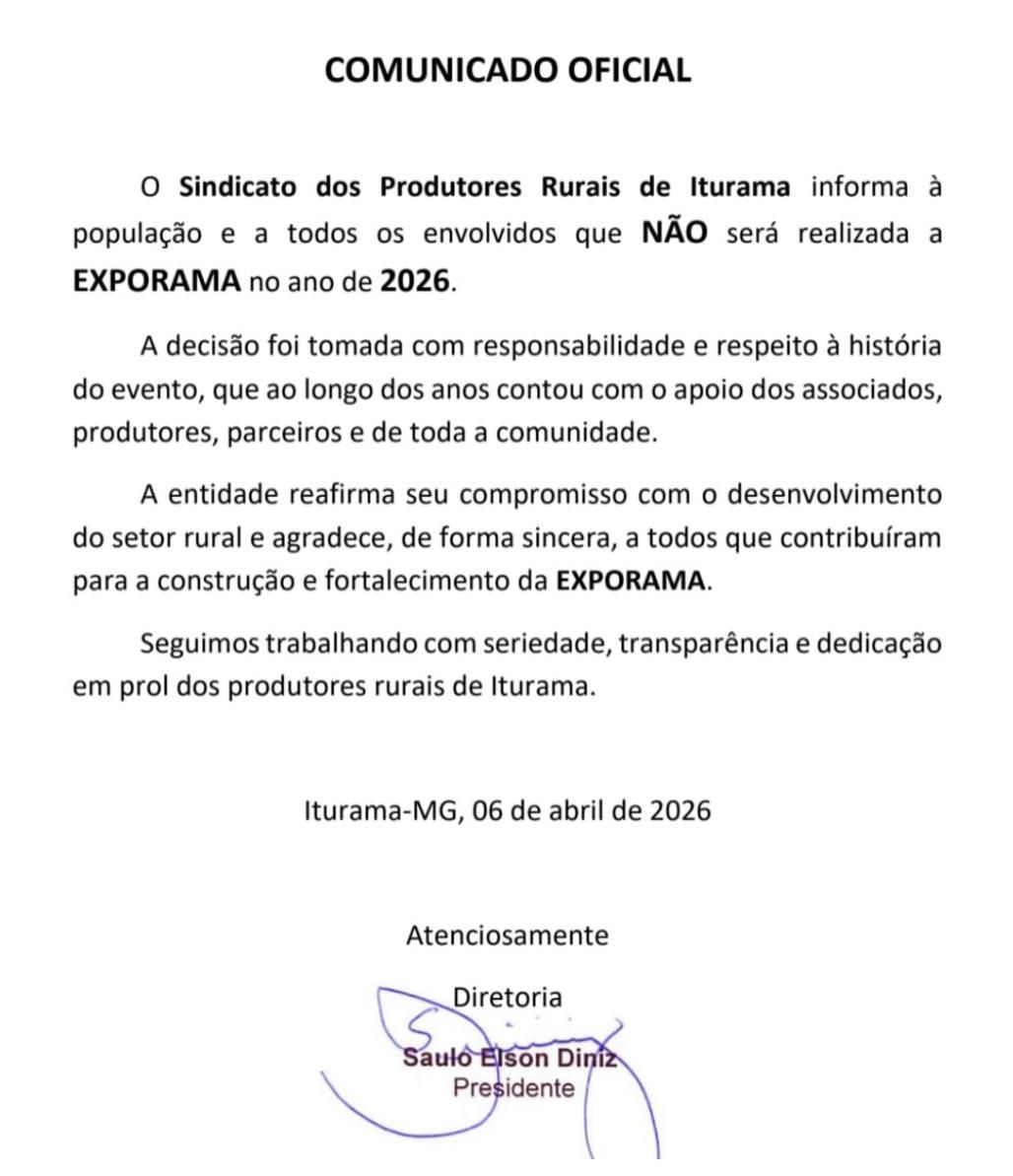 O Sindicato dos Produtores Rurais de Iturama anunciou, nesta segunda-feira (06), que a tradicional Exporama não será realizada em 2026. A decisão, segundo a entidade, foi tomada com responsabilidade e em respeito à história do evento, que ao longo dos anos contou com o apoio de produtores, parceiros e da comunidade local.