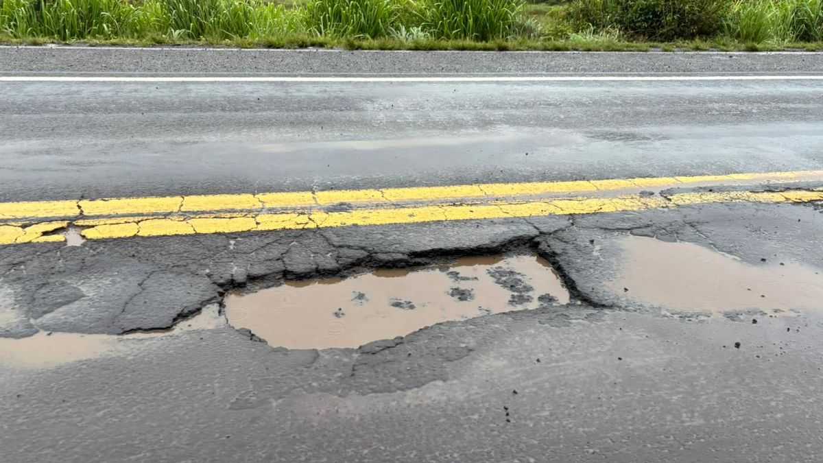 As fortes chuvas registradas no mês de janeiro intensificaram o desgaste da pista. A reportagem constatou buracos de grandes proporções, trechos críticos e pontes com deterioração visível — inclusive com crateras sobre o próprio pavimento das estruturas, elevando o risco de acidentes.