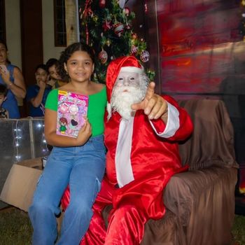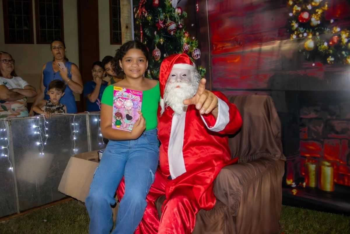 A praça recebeu uma decoração especial, com luzes, cores e elementos natalinos que transformaram o espaço em um verdadeiro cenário encantado. O bom velhinho foi recebido com entusiasmo pelo público e distribuiu carinho, sorrisos e presentes às crianças, proporcionando momentos de alegria que ficarão guardados na memória.