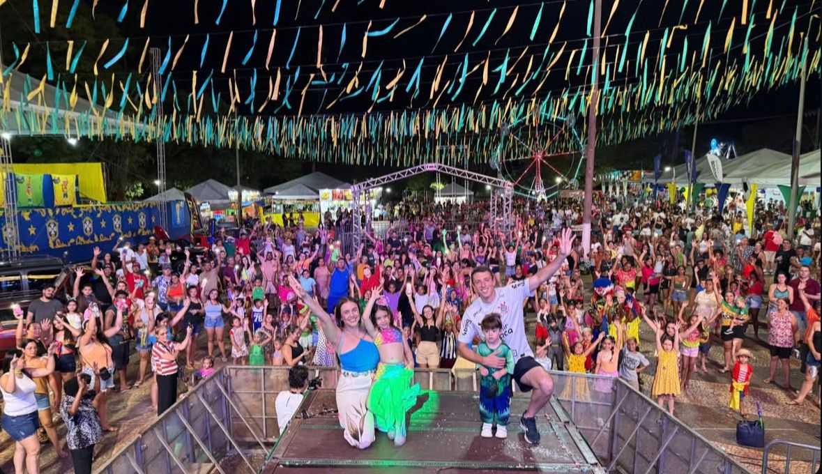 A apresentação da banda Atitude 67 levou a multidão ao entusiasmo máximo e lotou completamente a praça, marcando um dos momentos mais emblemáticos da festa.
